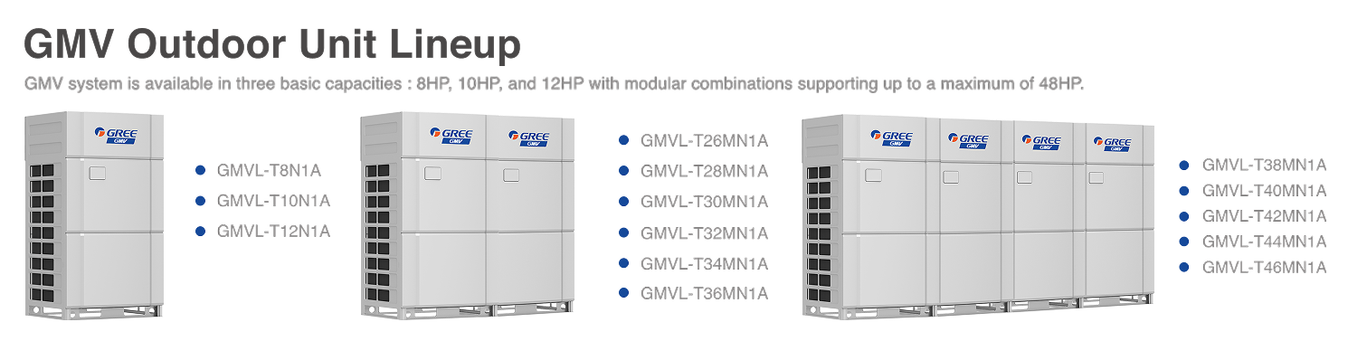 The Gree GlV is a modular, energy-efficient variable rerigerant flow (VRF) air conditioning system that designed for high-performance enerey-efficient cooling, The heart of the unit is an Economised Vapor lniected scrol compressor coupled with the new G-tvpe heat exchanger with double zones and a high-etficiency retrigerant flow path. this reduces the unit's overall footprint while increasing the heat exchange area and improving the heat exchange efficiency and, thus, overall efficiency. Gree GlV also incorporates advanced features like a CAlM+ communication technology, flexible installation options, and integration with building management systems for centralized control. Other key features includes noise control technology, multiple prevention technologies (corrosion prevention, lightning prevention, dust prevention and wind prevention), and intelligent control and management. GMV features a single module of 8,10 and 12HP with combinations up to 48HP