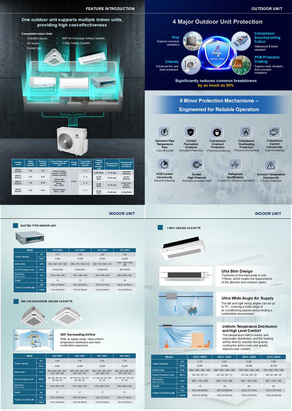 One outdoor unit supports multiple indoor units, offering excellent cost-effectiveness and flexible installation options. Compatible with both wall-mounted and ducted units, it ensures easy setup and maintenance. The wall-mounted option features a multilayer filter system for cleaner air, black fin corrosion protection for enhanced durability, and smart connectivity via Wi-Fi and Bluetooth using the Gree+ app, making it a smart, reliable choice for modern living.
